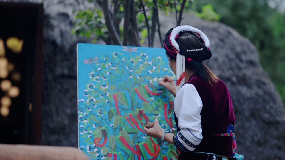 云南大理双廊镇伙山村有个农民画社,92岁的王秉秀老人从78岁起拿起画笔,把绣花的技法用到绘画上,将田间的耕耘、山间的景致、世代相传的民俗风情融入画作。