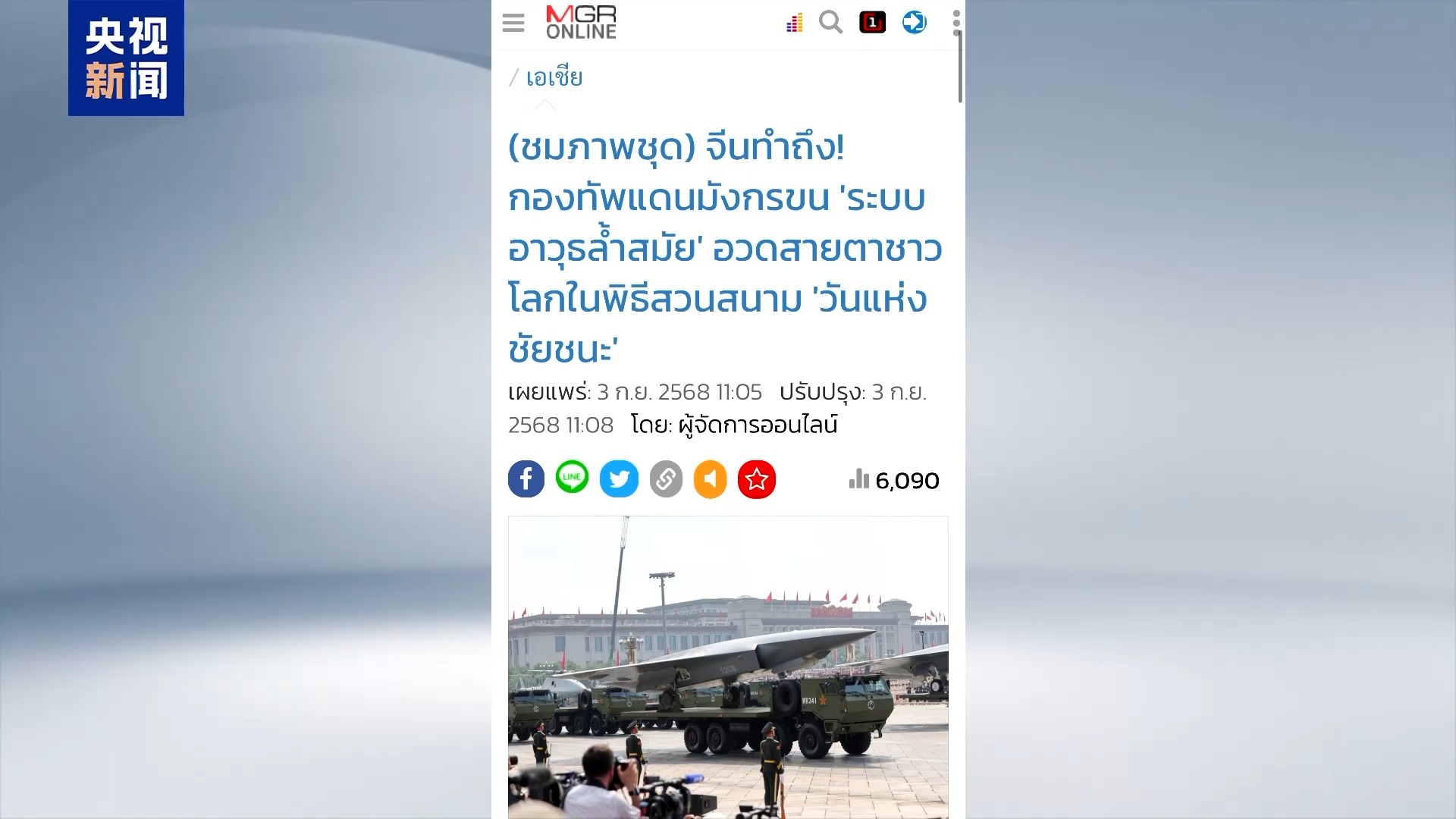 此外,泰国媒体也对九三阅兵进行了大量报道。泰国《经理人报》写道:“此次阅兵展示的新型武器装备达到了前所未有的高度。” 《曼谷商报》评价称,这次纪念活动不仅展示了中国的军事实力,也在亚洲乃至更远地区展现了其外交影响力。