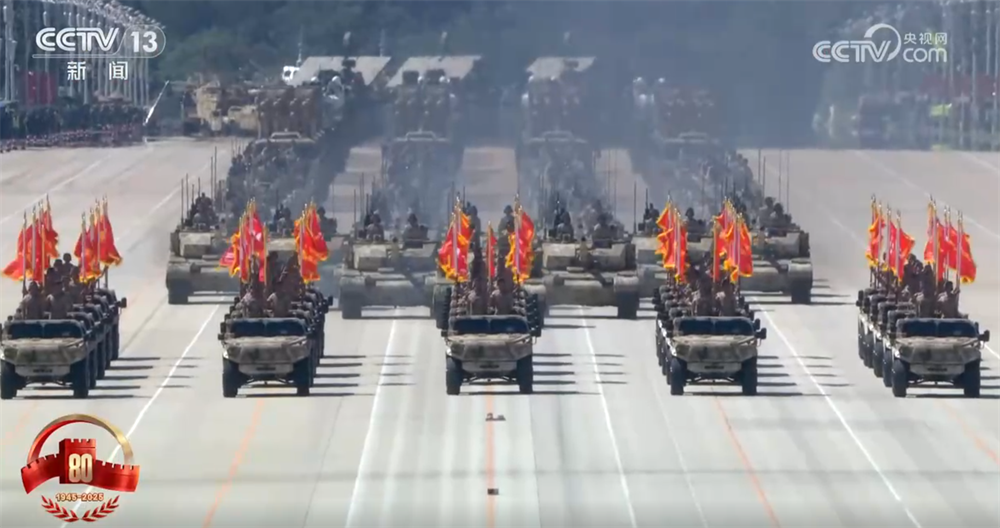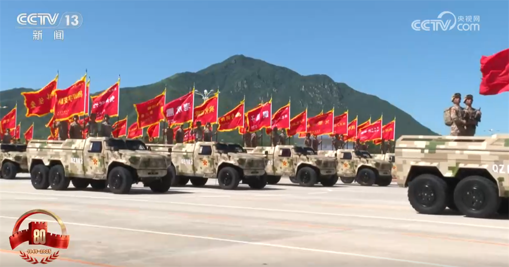 战旗方队,由25辆新型猛士突击车组成,车上搭载的荣誉战旗都是从八路军、新四军、东北抗联、华南游击队等授称命名单位中遴选,是我军在抗日战争时期艰苦卓绝战斗的缩影,承载着我军抗击日寇、抵御侵略的苦难辉煌。
