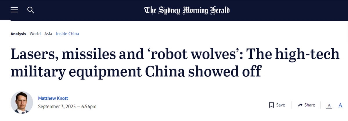 澳大利亚《悉尼先驱晨报》报道称,中国阅兵式上展示了弹道导弹、激光武器、战斗机、水下无人潜航器,甚至还有“机器狼”。