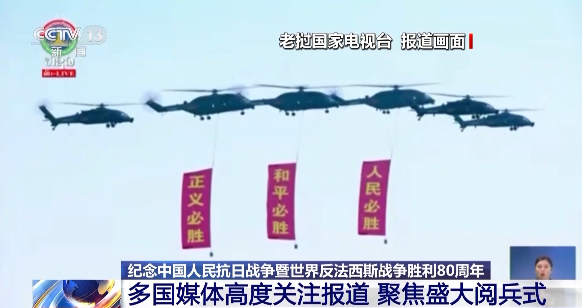 老挝国家电视台在黄金时段《晚间新闻》中头条报道了纪念中国人民抗日战争暨世界反法西斯战争胜利80周年活动。报道指出,此次活动,纪念中国军队和人民在第二次世界大战期间与世界各国一道,反对外来侵略并赢得胜利,获得自由与独立,为中国和世界各国带来繁荣与昌盛。