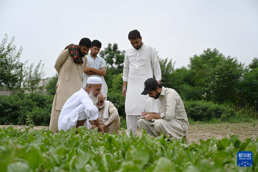 8月13日,在巴基斯坦东部旁遮普省阿塔克县,农民穆罕默德·萨夫达尔(右)查看农田中引进自中国天津的花椰菜苗。 新华社发(达尼亚勒·汗·贾敦摄)