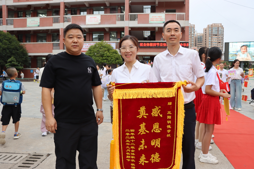 华声在线9月10日讯(通讯员 余玉龙 余思思)“教师节送锦旗,是感恩,是致敬,更是祝福!”9月10日早晨,平江县三阳明德学校四年级12班家长代表将两面鲜红锦旗送至学校,表达对教育工作者的感恩之情,成为学校“点亮师恩,感念师情”第41个教师节主题活动上最温暖的小插曲。