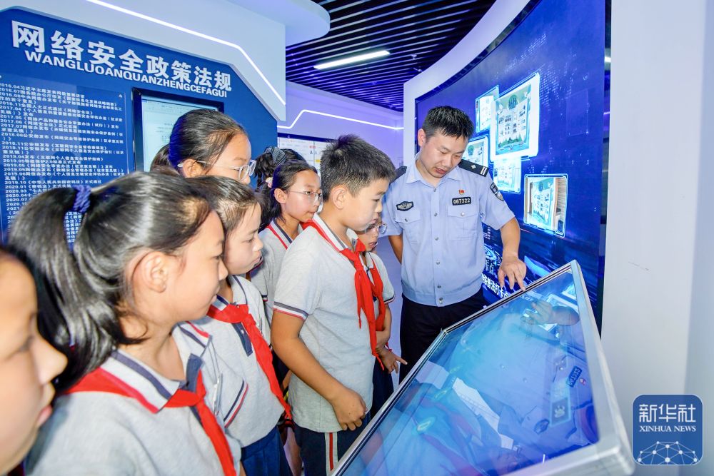 9月15日,在山东省青岛市市北区延安二路小学开展的网络安全教育主题活动上,民警为学生们讲解防范电信诈骗小常识。新华社发(王海滨摄)