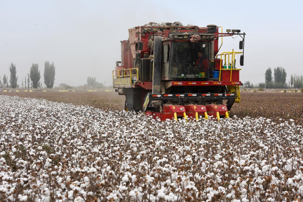 2024年10月24日,在新疆阿瓦提县,一台大型采棉机在棉田里作业。新华社记者 高晗 摄