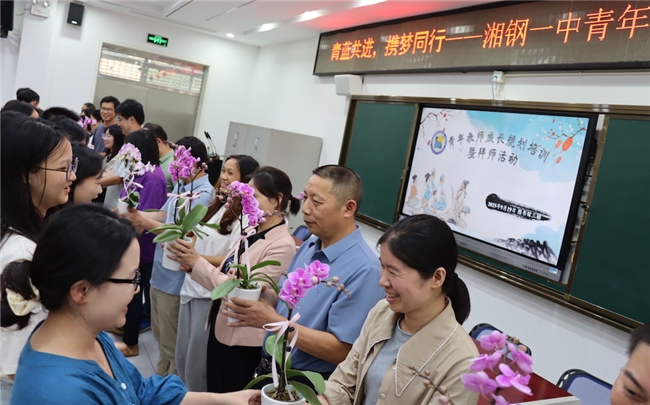 徒弟们为师傅挑选盛开的兰花,缓步走向各自的导师——献花轻放于师傅手中,深深躬身行拜师礼,眉眼间满是对导师倾囊相授的敬意。这一礼,无关形式,只为铭记“前辈引路”的温暖,藏着“潜心向学”的决心。师徒传承正如这些静静吐露芬芳的兰花,幽香致远。愿此后师徒并肩,在备课磨课中互促,在答疑解惑中共进,于教育路上同攀新峰。