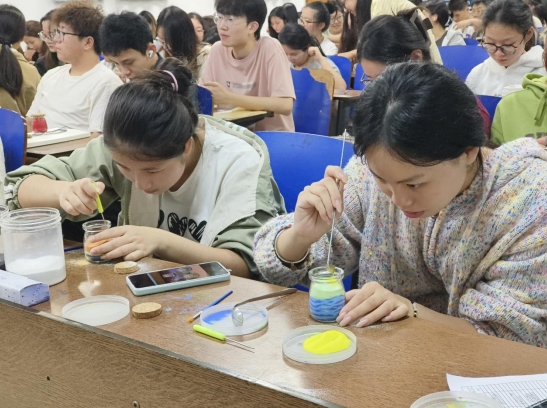 沙画艺术作为新兴的综合性艺术形式,融合绘画、音乐、灯光与舞台表演,以其瞬息万变的视觉魅力深受年轻人喜爱。“沙画不仅是技巧的展现,更是情感的表达。”谭珊珊老师现场指导学生尝试创作,鼓励大家用沙子讲述自己的故事。许多学生首次接触沙画便展现出浓厚兴趣,纷纷表示:“沙画的自由与灵动让人放松,也让我们重新理解了传统文化的现代表达。”