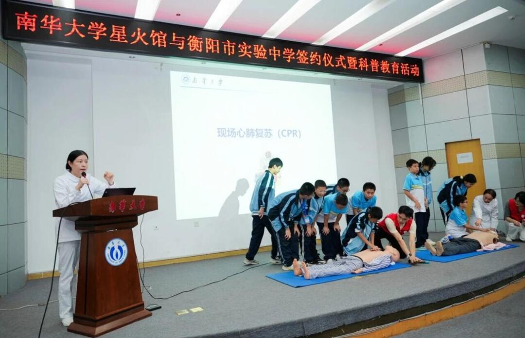 签约仪式后,南华大学护理学院专家团队为在场师生带来一场生动实用的心肺复苏急救科普讲座。通过理论讲解、现场演示和互动体验,学生们初步掌握了CPR基本技能,增强了对生命守护的认知与责任感。