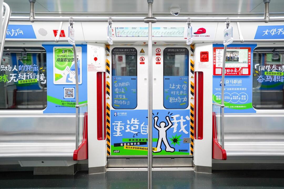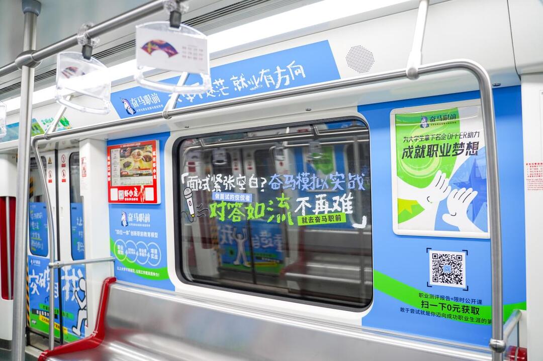 奋马职前地铁专列以清新明亮的“梦想蓝”为主色调,将品牌主视觉贯穿始终,再搭配灵动感十足的手绘图案和温暖人心的文案,营造了朝气蓬勃的车厢宣传氛围。车厢内还精心布置了“大学不迷茫 就业有方向”“认知自我 突破自我 重造自我 成就自我”等鼓励性标语,直击大学生群体在职业规划与个人发展中的痛点与需求,引发了广泛共鸣。