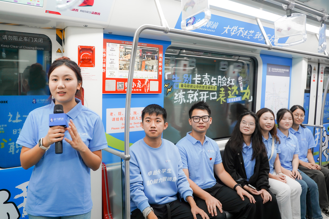 9月26日上午,奋马职前在长沙地铁2号线的主题列车上举办了一场“‘奋马职前体验号’——解锁你的超能力”车厢快闪活动,利用乘客的通勤时间,带来了一场别开生面的“职前教育体验课”。