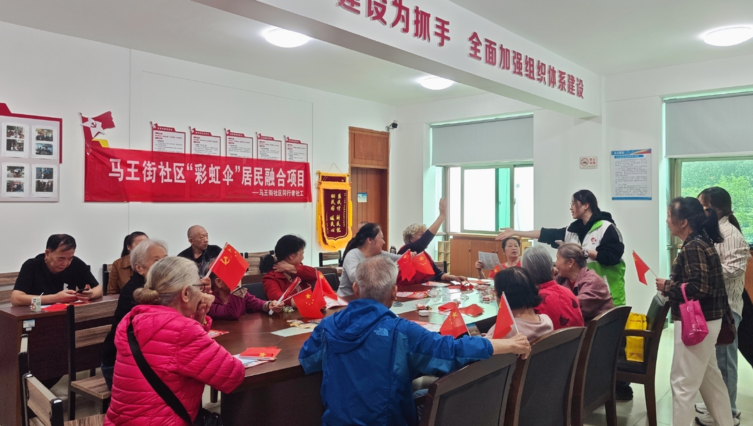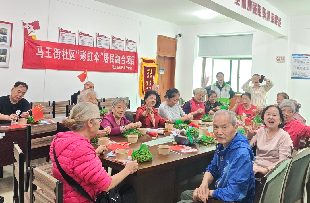9月26日上午,长沙市芙蓉区定王台街道办事处马王街社区活动室内歌声与笑声交织,社区居民围坐一堂,或跟着旋律轻哼红色歌曲,或指尖翻飞剥着毛豆——这是马王街社区“彩虹伞”居民融合项目推出的“共筑爱国情 同庆好时光”主题活动现场,用最接地气的方式迎接国庆佳节。