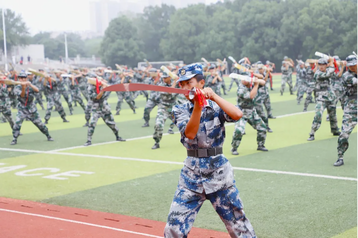 方阵展示完毕后,三场极具感染力的表演,将抗战历史与青春力量紧密相连。首先登场的拳术表演中,数百名学子手持翻花板,在指令下迅速变换队形——“80”的图案缓缓展开,寓意着抗战胜利 80 周年的特殊时刻,之后迅速变换队形,摆出倒计时。倒计时结束后,翻花板落下,学子们迅速摆出军体拳架势,出拳、踢腿、格挡,每一个动作都刚劲有力,虎虎生威,象征革命先辈的英勇顽强和新时代青年的阳刚之气。仿佛在重现革命先辈与敌人殊死搏斗的场景。紧接着,《大刀进行曲》的激昂旋律响起,数十名身着抗战军装的学子手持大刀,迈着整齐的步伐登场。劈、砍、斩、扫,每一招都带着雷霆之势,将在场师生带回那个“大刀队奋勇杀敌”的年代。表演者眼神坚定,动作铿锵,用最质朴的方式,诠释着“不畏强敌、敢于亮剑”的抗战精神。随着旋律的转变,急促的音乐响起,学子们迅速抽出匕首,展开匕首操表演——突刺、格挡、反击,每一个动作都干净利落,展现出守护家园的决绝;下半段,音乐转为舒缓的《精忠报国》,学子们放下匕首,以手语操传递情感。随着歌曲的节奏,他们的手势时而坚定,时而轻柔,将对祖国的热爱与忠诚,融入每一个细微的动作中。刚与柔的碰撞,让在场师生深刻感受到:中华儿女的爱国情怀,既有 “捐躯赴国难” 的刚毅,也有 “润物细无声” 的深情。