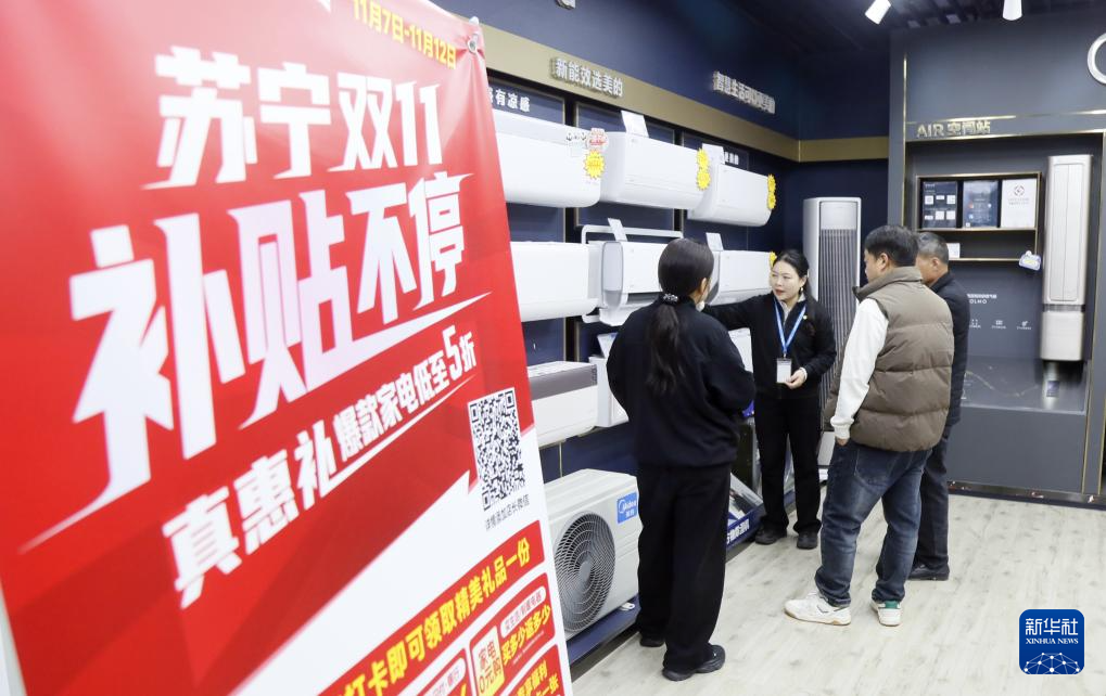 11月11日,在河南省洛阳市汝阳县刘伶路苏宁店,店员向消费者宣传国家补贴政策。