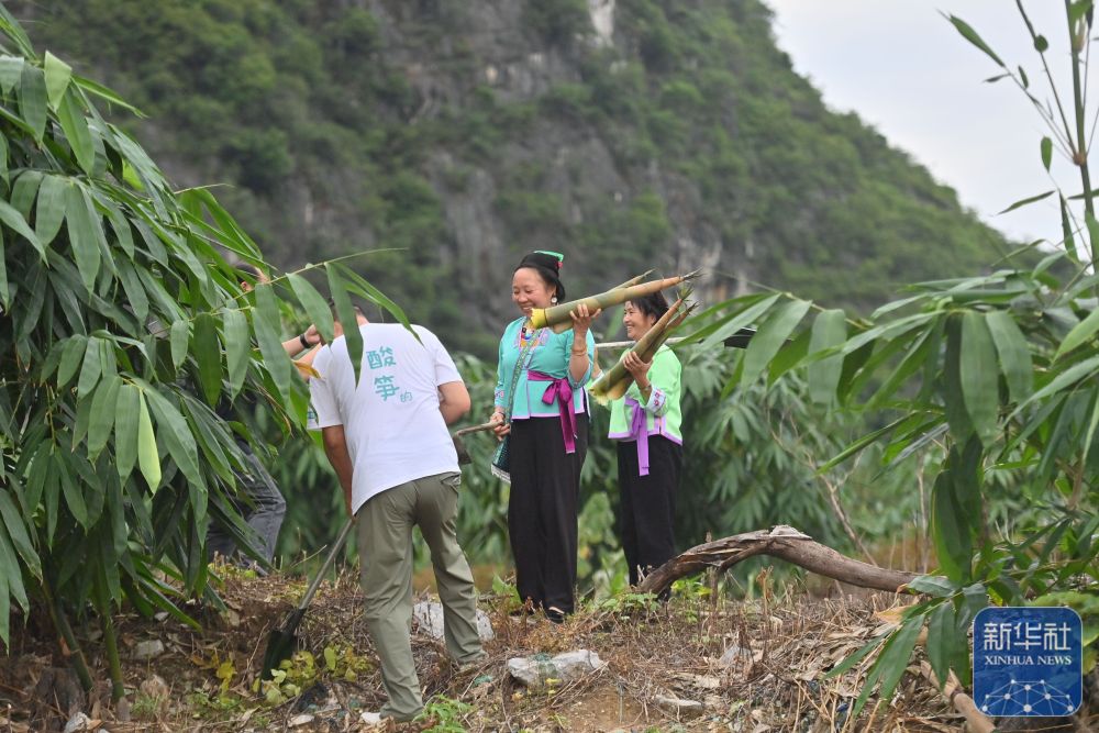 ↑ 在广西柳州市柳江区成团镇六道村,乌英苗寨妇女梁足英(中)、吴妹富(右)和企业负责人在采摘竹笋(6月28日摄)。
