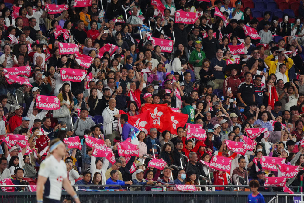 11月14日,在香港举行的第十五届全国运动会7人制橄榄球男子决赛中,球迷在场边加油助威。新华社记者 朱炜 摄赛事期间,大湾区文旅消费活力显著提升,相关酒店、机票、火车票及景点搜索量大幅增长,零售、餐饮等行业也同步迎来销售高峰。
