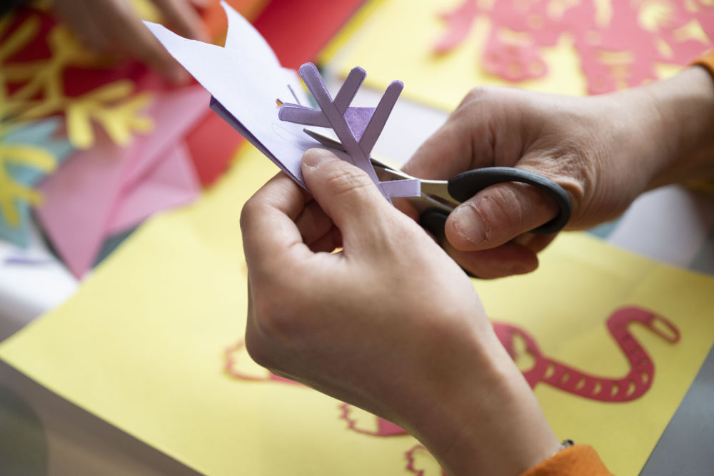 11月26日,游客在Y783次“悠享龙江·银旅号”旅游列车上体验剪纸。新华社记者 张涛 摄