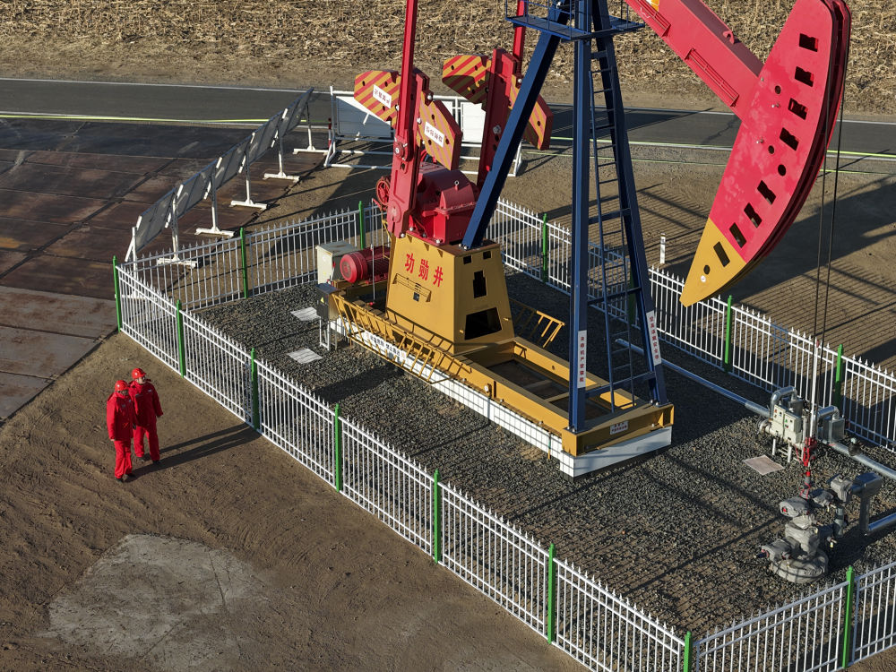 ↑ 12月4日,在大庆古龙陆相页岩油国家级示范区,中国石油大庆油田第九采油厂页岩油生产运行项目经理部生产操作员对功勋井古页油平1井采油设备开展巡检工作(无人机照片)。