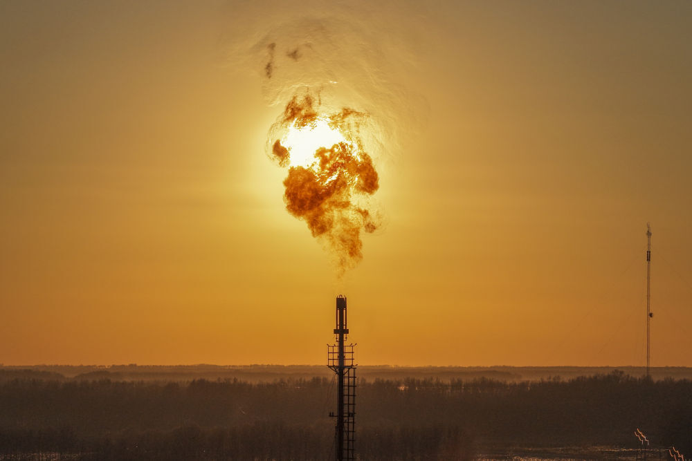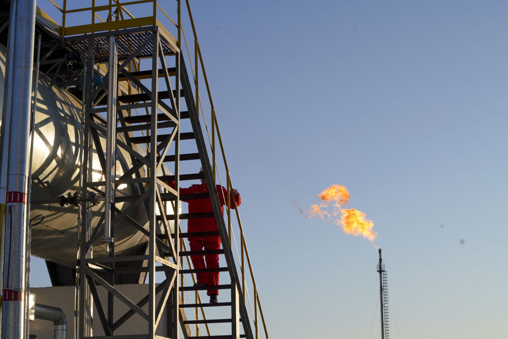 ↑ 这是12月4日在黑龙江省大庆市杜尔伯特蒙古族自治县境内大庆古龙陆相页岩油国家级示范区拍摄的古页1号站放空火炬(无人机照片)。