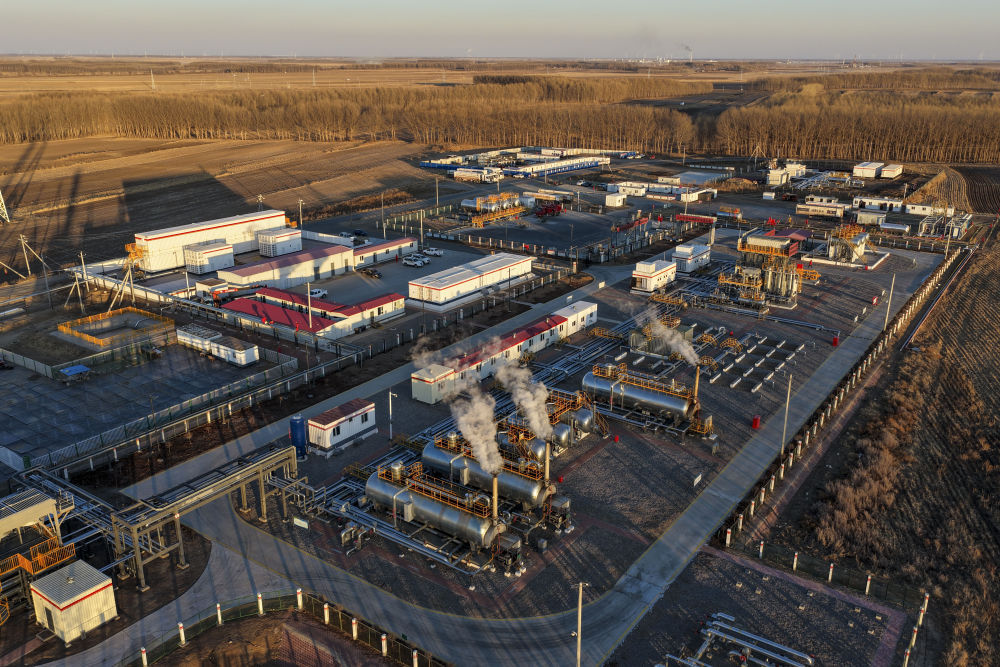 ↑ 这是12月4日在黑龙江省大庆市杜尔伯特蒙古族自治县境内大庆古龙陆相页岩油国家级示范区拍摄的古页1号站(无人机照片)。