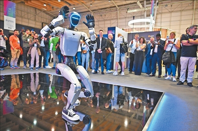 在葡萄牙里斯本举办的2025年网络峰会上,宇树科技的人形机器人和观众互动。 新华社发