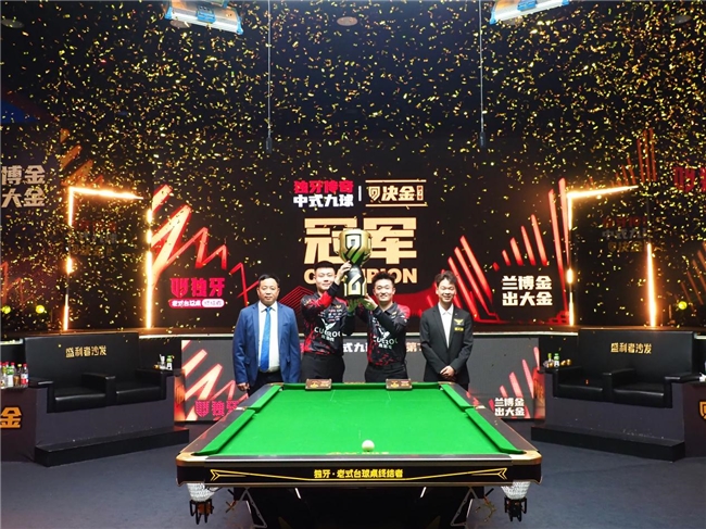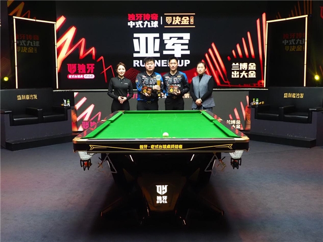 中式九球·决金第7季亚军由蹭个购商城战队获得,独牙传奇中式九球国际巡回赛裁判长王钟瑶与蹭个购商城总经理冷松一同为蹭个购商城战队曹宇鹏、赵剑波颁发奖章和奖杯。