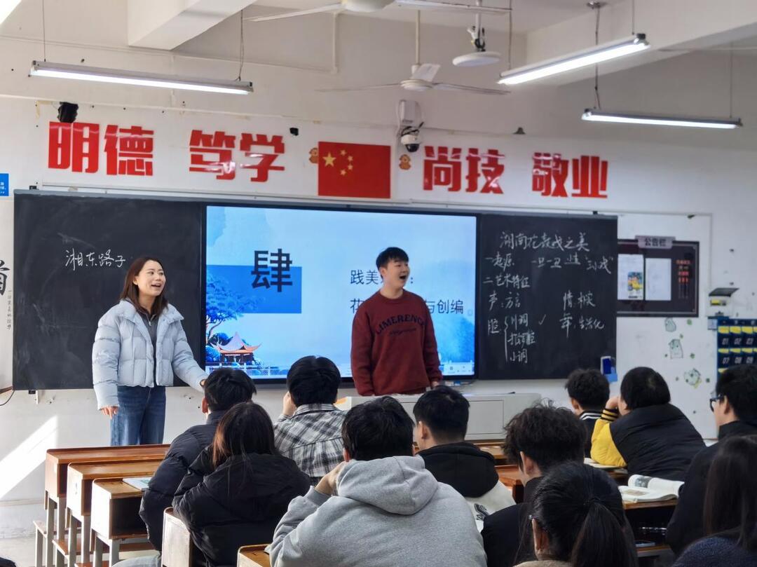 “我把你比牛郎,不差毫分哪……”一段韵味十足的花鼓戏唱腔在湖南有色金属职业技术学院教室里响起,引得现场学生凝神注目。台上,学院美育教师周婷正携手省级花鼓戏非遗传承人同台对唱,两人声情并茂、配合默契,将传统戏曲的感染力展现得淋漓尽致。