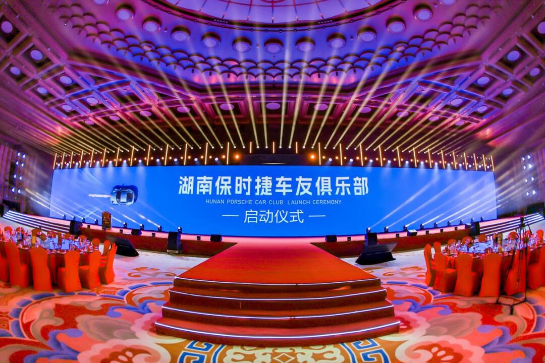 仪式在充满未来科技感的灯光艺术中拉开序幕。光影交错间,保时捷经典的设计线条与进取精神被完美勾勒,营造出梦幻而热烈的氛围。现场高朋满座,汇聚了湖南保时捷车友俱乐部的核心发起成员、众多尊贵的保时捷车主,以及对汽车文化满怀热忱的各界名流与嘉宾,共同见证这一具有里程碑意义的时刻。