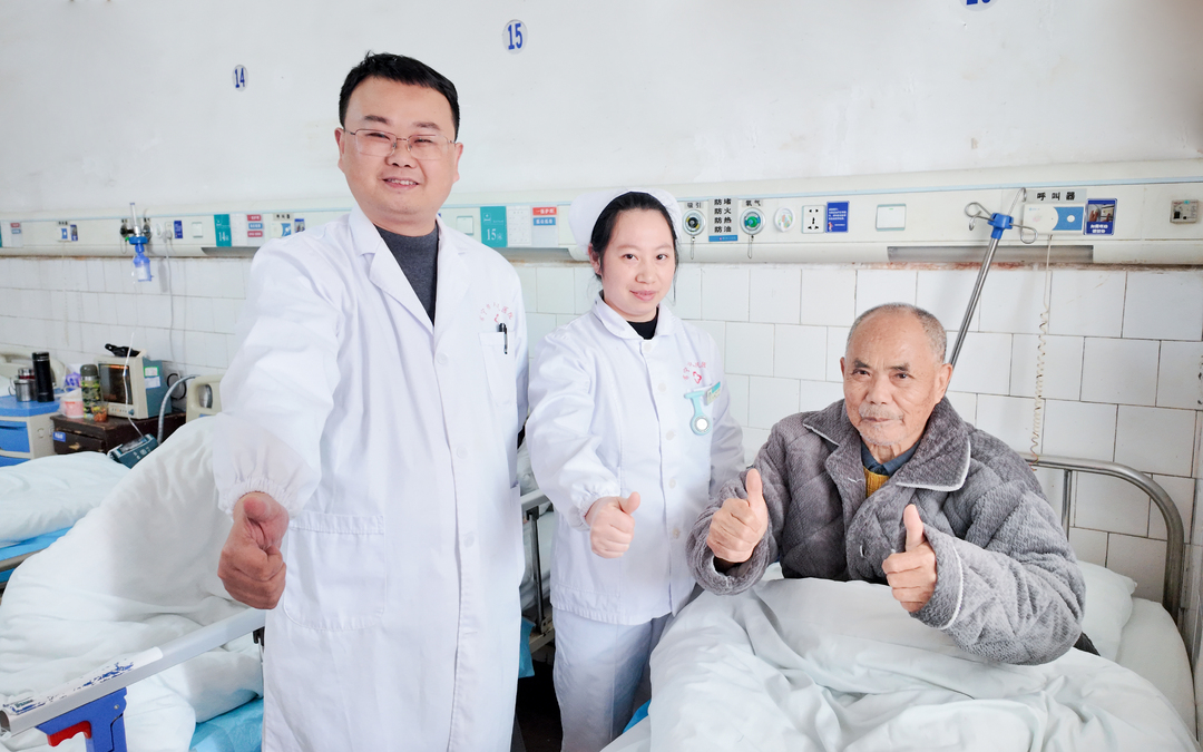 神经内科一区主任詹行荣、护士刘倩与周爷爷合影