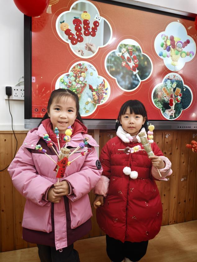 亲子手工环节成为本次活动的一大亮点。家长与孩子们共同参与《黏土新年糖葫芦》制作,用红、黄、橙三色黏土制作“山楂球”“水果造型”,串上木质签子,搭配“福”字贴纸装饰,一个个创意十足、充满年味的糖葫芦作品应运而生。孩子们手持亲手制作的作品在背景板前拍照留念,脸上洋溢着满满的成就感。颁奖环节,老师们为每位幼儿颁发了专属奖状,鼓励他们在未来的成长道路上继续发光发热。最后,全体师幼与家长手持奖状和手工作品拍摄集体大合照,为本次休学典礼画上圆满句号。