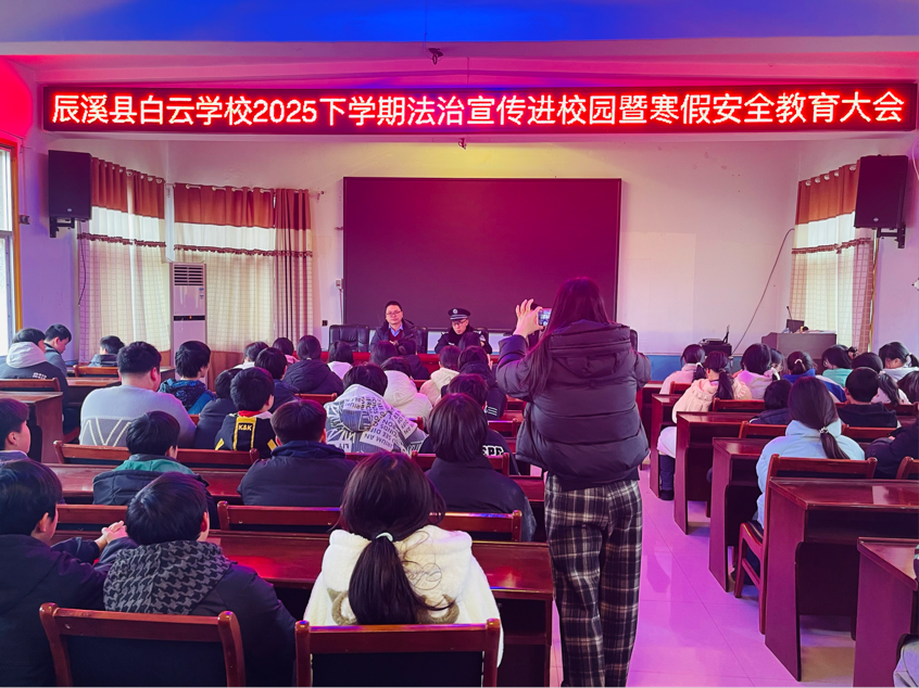 寒假临近,为筑牢校园安全防线,强化师生法治观念与自我保护意识,近日,辰溪县白云学校隆重举行“法治宣传进校园暨寒假安全教育大会”。学校法治副校长宋所长应邀莅临授课,张小明校长发表动员讲话,共同聆听这场兼具法律威严与人文关怀的“假期安全必修课”。