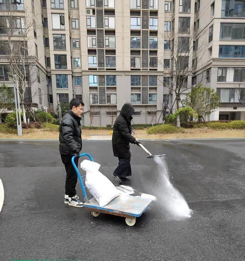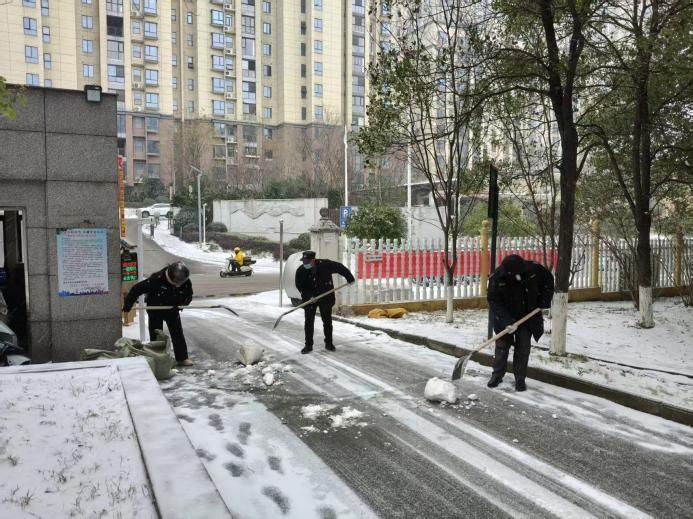此外,面对寒潮降雪天气,多个分公司“以雪为令”,迅速行动。岳阳、耒阳、泉井、澧州龙城、汨罗、溪州、益阳等分公司提前储备融雪剂、铁锹等物资,启动应急预案。工作人员天未亮便穿梭在风雪中,铲冰、撒盐、清扫积雪,重点清理主干道、单元门口、地下车库出入口等关键区域。泉井分公司还在单元门厅铺设防滑地垫、放置提示牌,楼栋管家主动上门关心老年业主与特殊家庭;益阳分公司利用广播和业主群发布安全提示,排查断落树枝与路障,用坚守为业主筑起温暖安全防线。