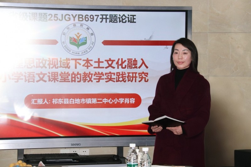 论证会上,由祁东县白地市镇第二中心小学校长洪自海牵头申报的语文课题《课程思政视域下本土文化融入小学语文课堂的教学实践研究》作了开题汇报。课题主持人肖容老师代表课题组作论证陈述,系统阐述了课题的研究目标、内容、方法及实施计划。