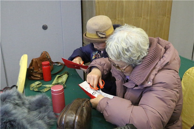 进入裁剪环节,李老师高举手臂,以便让他们更加清楚剪纸的裁剪要点,红纸在她手中几经折叠、剪裁,骏马的眼睛便出来了。参与者们纷纷拿起剪刀,认真折叠、精心剪制。红纸翻飞间,一匹匹形态各异的骏马逐渐成型——有的俊俏昂首,有的憨态可掬,有的华丽复杂。虽然剪纸本已勾勒好骏马基本形态,但在剪裁的过程中,加入了参与者他们自己的心得,银龄巧手创造出了属于他们自己的独一无二的作品。现场氛围热烈而专注,剪刀与纸张摩擦的细微声响不影响他们的沉浸,剪制完成后,大家小心翼翼地将作品装裱入框,将这份承载着集体记忆与新春期盼的艺术品带回家珍藏。