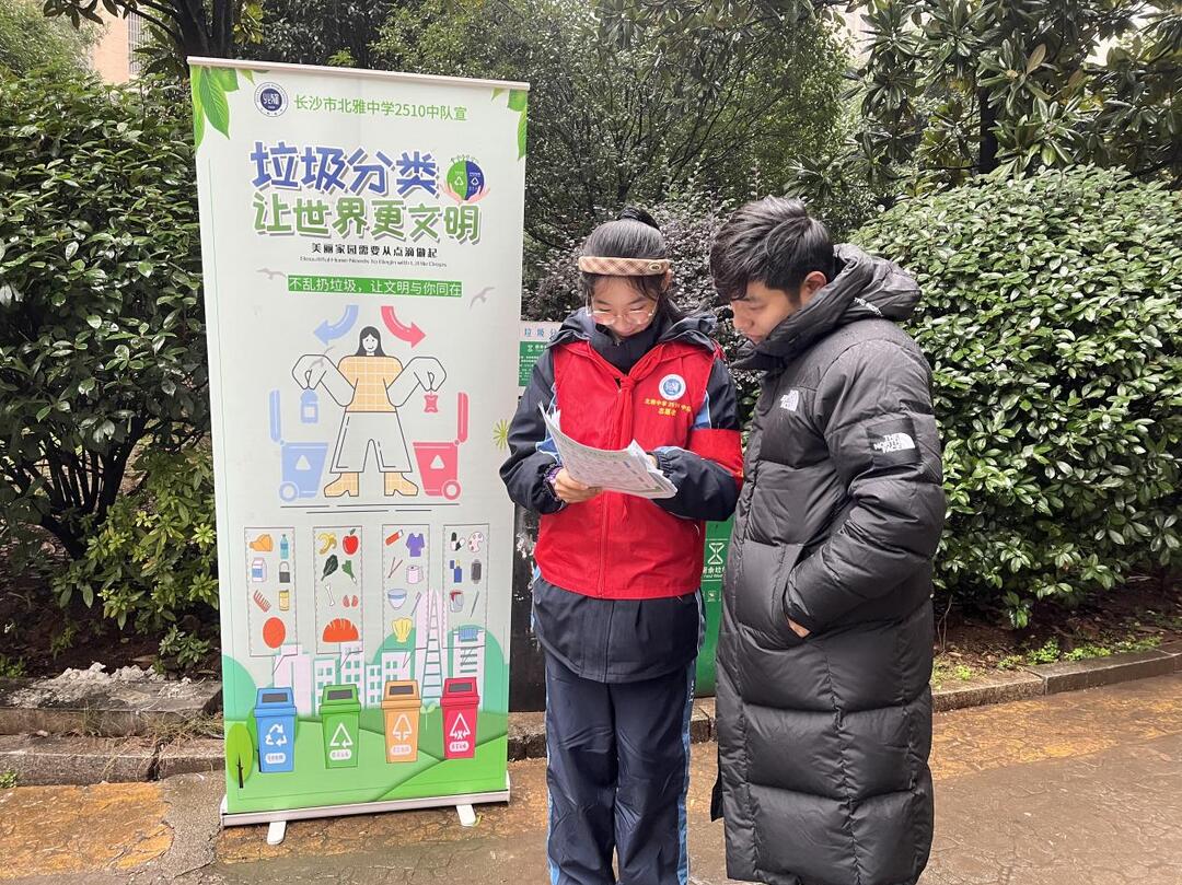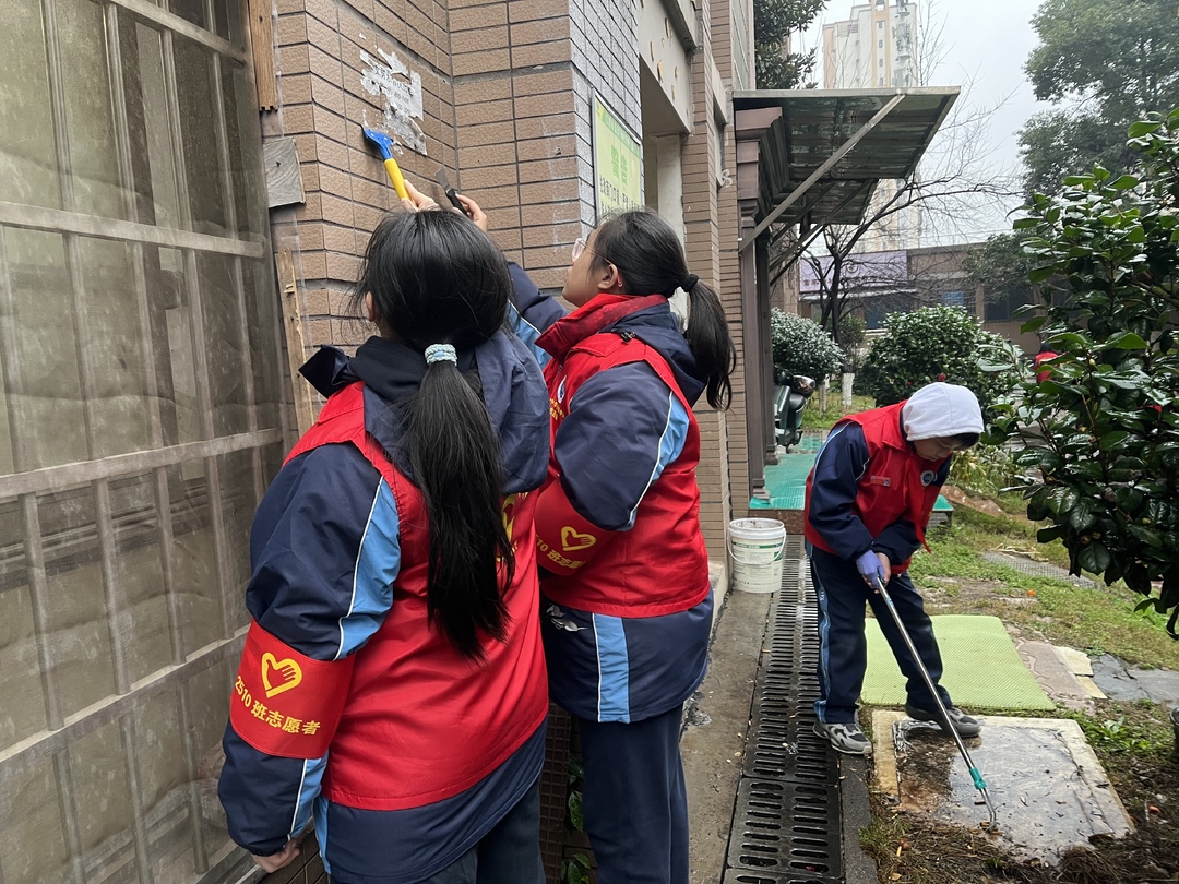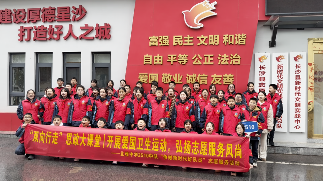 1月30日下午,长沙市北雅中学2510中队辅导员肖润泉带领全体队员前往长沙县新时代文明实践中心报到,一场充满新时代意义的爱国卫生运动在此火热开展。队员们以饱满的热情投身其中,用实际行动弘扬“奉献、友爱、互助、进步”的志愿服务精神,为社区环境的改善增添了一抹亮丽的色彩。