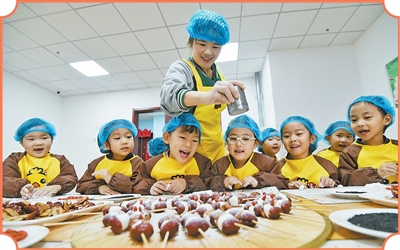 山东省乐陵市天和嘉园幼儿园,小朋友在老师帮助下体验面食制作。