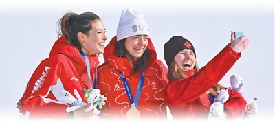 自由式滑雪女子坡面障碍技巧决赛后,亚军中国队选手谷爱凌(左)和冠军、季军合影。 新华社记者 张宏祥摄