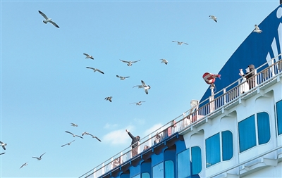 山东省烟台市,乘船前往大连的旅客在甲板上喂海鸥。 唐 克摄(人民视觉)