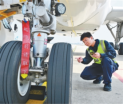 海南省海口市,美兰国际机场,工程师进行飞机航前检查。 纪巧珠摄(影像中国)