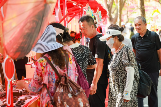 市集围绕“归·福泽”主题,精心规划了非遗、文创产品、美食小吃三大功能区。熙熙攘攘的人群中,既有举家出游的本地市民,也有慕名而来的外地游客,大家或驻足观赏非遗技艺,或品尝地道琼味,欢声笑语此起彼伏。