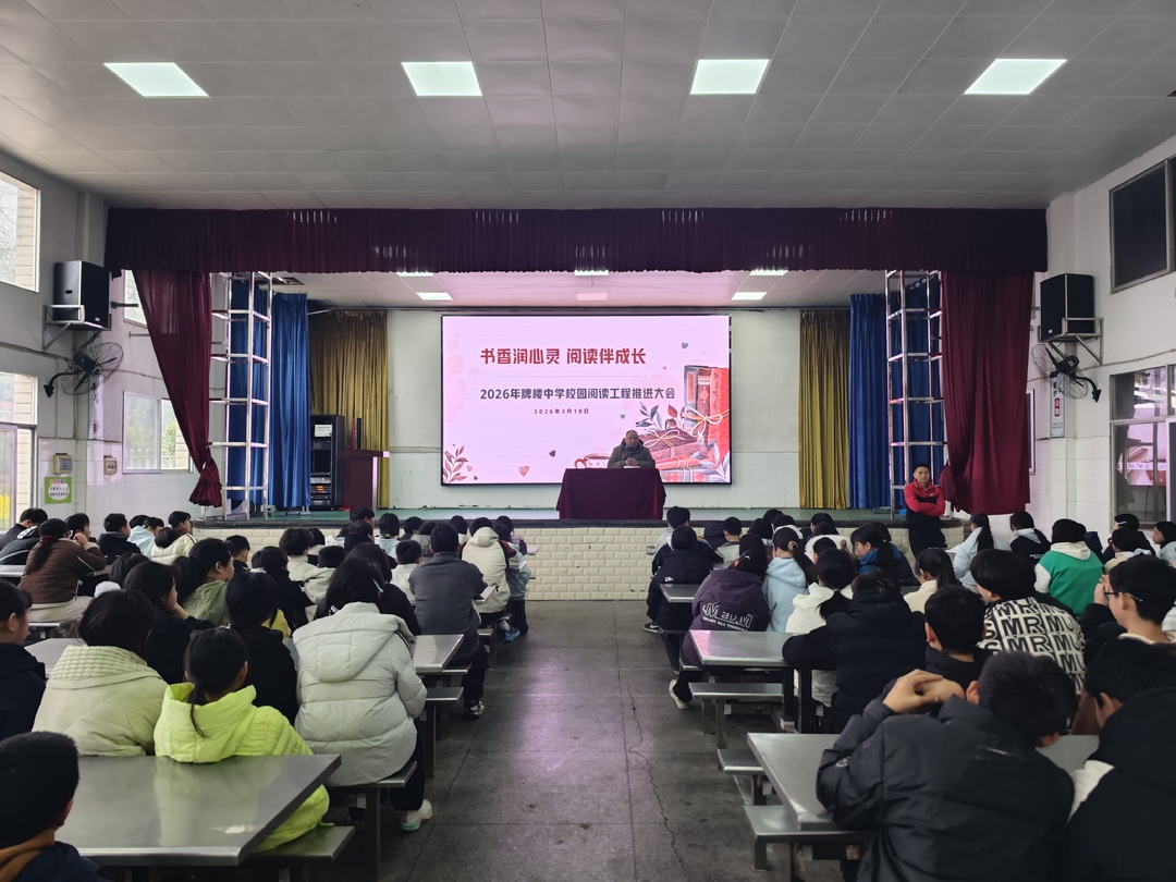 为深入贯彻市县阅读教育工作精神,营造浓厚书香校园氛围,2026年3月18日,中方县中方镇牌楼中学举行“书香润心灵,阅读伴成长”2026年校园阅读工程推进会。全校师生齐聚一堂,共同开启新一年的阅读之旅。