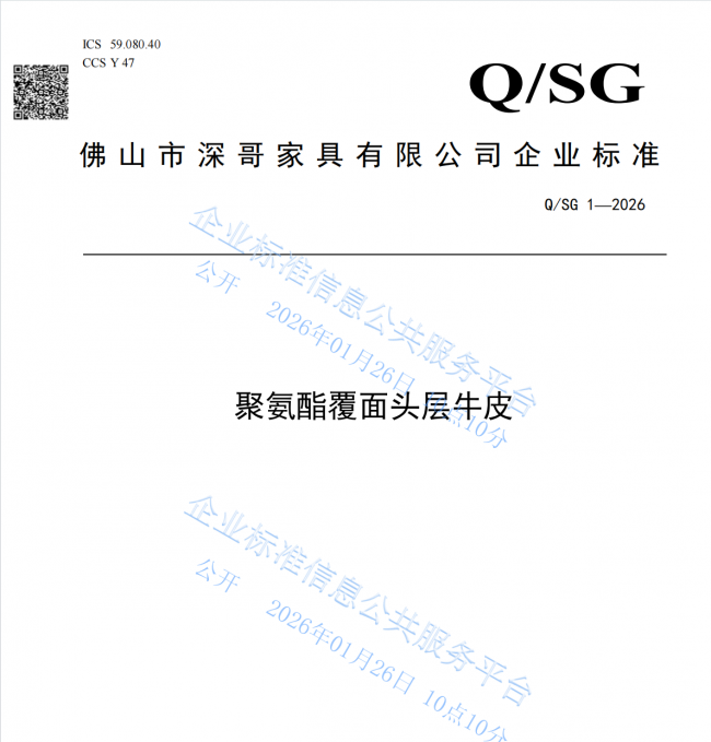 这份底气,不是拍脑袋决定的。翻开源代码深哥家具2026年1月发布的三份企业标准——《聚氨酯覆面头层牛皮》《聚氨酯覆面头层牛皮沙发》《聚氨酯覆面头层牛皮软体床》,整整26页的技术文件,密密麻麻写满了各项指标的严苛要求。