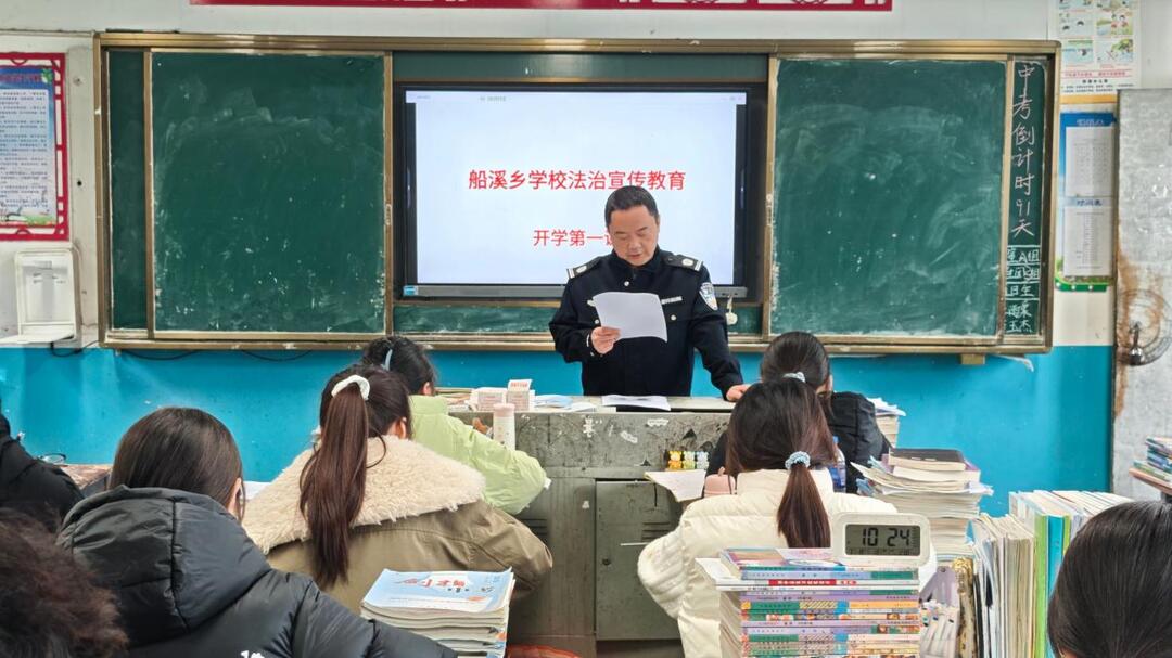 活动中,船溪乡派出所民警、学校法治副校长谢波以 “法治护航成长” 为主题,为同学们带来一堂生动实用的法治教育课。课堂上,谢波副校长结合身边典型案例,用通俗易懂的语言,重点围绕未成年人保护、预防校园欺凌、扫黑除恶、禁毒知识普及、自我安全防范等内容进行细致讲解,教育引导广大学生自觉尊法学法守法用法,在遇到危险和侵害时学会运用法律武器保护自己。宣讲过程中,宣讲员与学生积极互动,耐心解答同学们提出的问题,现场氛围热烈。