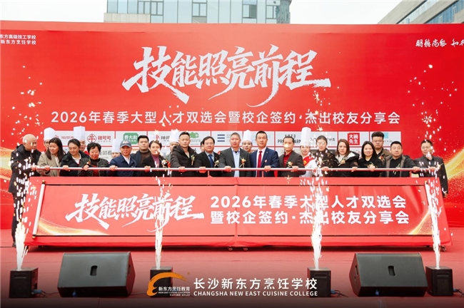 春风送暖,匠星闪耀。2026年春季,长沙新东方烹饪学校隆重举办技能照亮前程 匠心筑梦未来——2026春季大型人才双选会暨校企签约・校友分享会!本次活动携手22家餐饮行业知名企业,以校企深度融合为纽带,为学子搭建高质量就业对接平台,让该校学子与优质企业双向奔赴,共绘餐饮人才培养与行业发展的双赢蓝图。