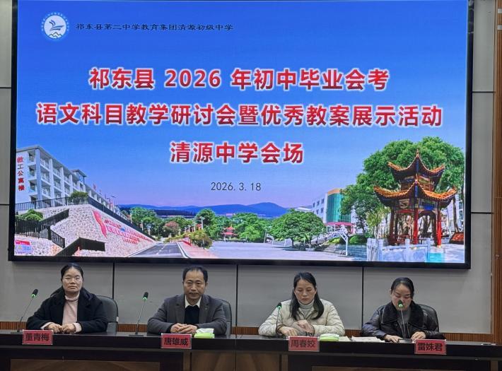 春启新程,研途芬芳。新学期刚开始,祁东县中学语文名师工作室就开始忙起来了。3月18日,在县教研室统筹组织下,祁东县中学语文名师工作室率先在清源中学成功举办了“2026年初中毕业会考语文科目教学研讨会暨优秀教案展示活动”。名师工作室主持人、祁东二中语文教师董青梅老师与工作室部分骨干教师走进全县初中语文教师代表之中,与他们共同探讨初中语文会考备考提质增效的良策。