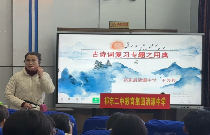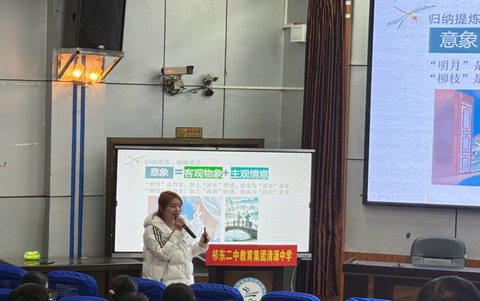 活动中,名师工作室首先指导选送了两节示范课,为复习教学提供了优秀范例。清源中学王芳芳老师执教的《古诗词专题复习之用典》,紧扣会考核心考点,将知识讲解与答题技巧有机融合,引导学生主动建构答题路径,让复习课堂高效且有温度。思源中学刘昭老师执教的《寻象入境,以意会情》,聚焦古诗词意境赏析与情感体悟,层层推进,带领学生品味经典之美的同时系统梳理应试策略,实现“品文”与“备考”双向赋能。