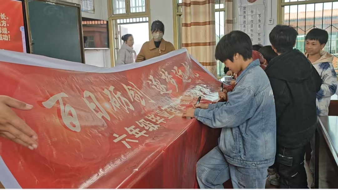 集体宣誓环节,全体同学誓言铿锵环节,全体同学誓言铿锵有力,“珍惜时光、自律自强、感恩母校、逐梦远航”的口号响彻校园。在签名明志环节,同学们郑重写下姓名与心愿,定格奋斗决心。