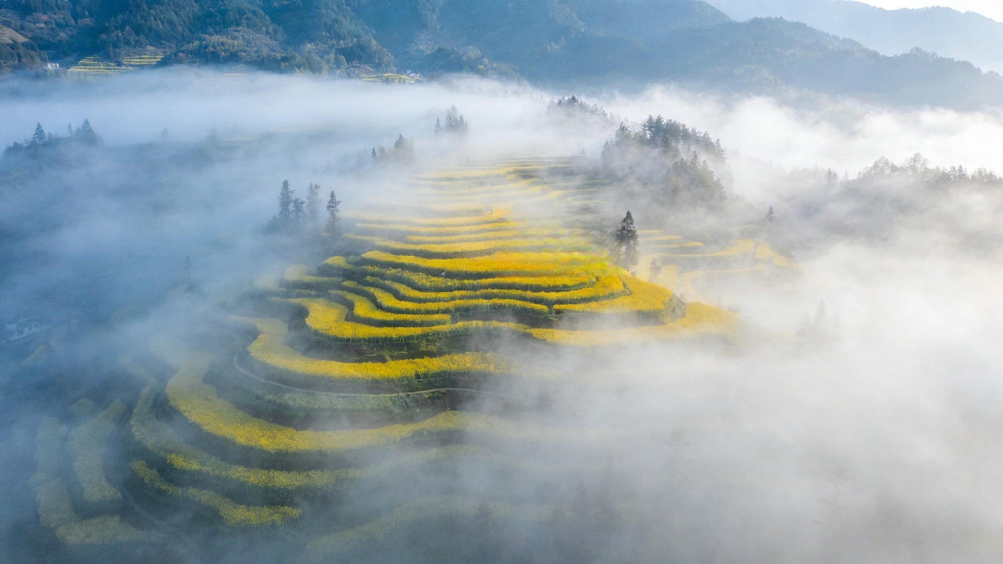 油菜花海与层层叠叠的梯田构成一幅秀美画卷(央广网发 文婷 摄)