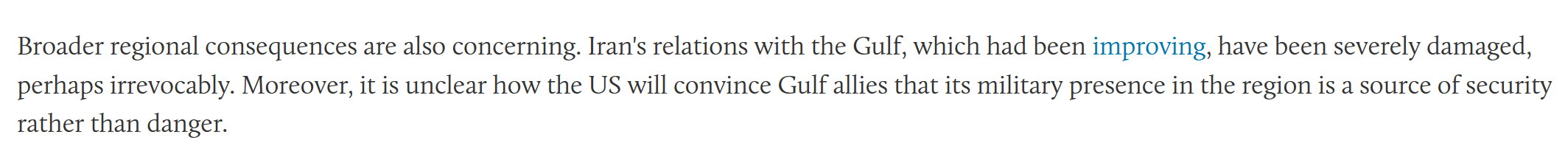 文章称,战争已经造成了深远的损害——成千上万人伤亡、基础设施广泛受损、经济危机加深等等——但一场旷日持久的战争将造成更大的后果。海湾国家已经被波及,复苏之路漫长。专家指出,战争结束后,更广泛的地区后果也令人担忧。伊朗与海湾国家本已改善的关系遭到严重破坏,或许无法挽回。此外,目前尚不清楚美国将如何说服海湾盟友其军事存在是安全的保障而非危险。