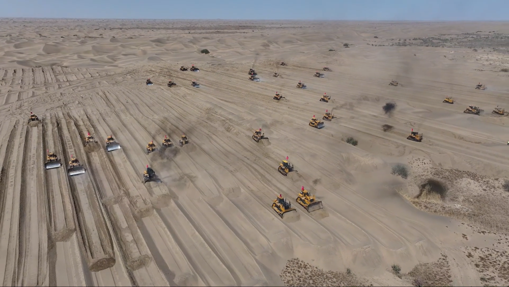 图为2025年3月拍摄的新疆生产建设兵团第十四师昆玉市7.38万亩沙漠工程治理区施工现场,推土机正在作业。