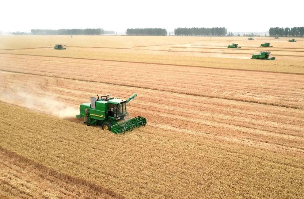 在河南省黄泛区农场九分场的麦田里,农机手操作大型收割机收获小麦(无人机照片)。新华社记者 李嘉南 摄